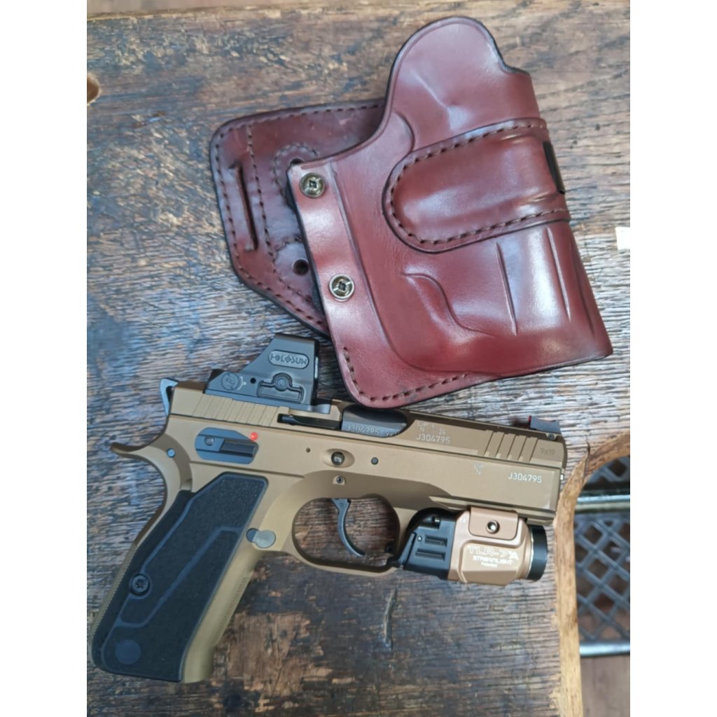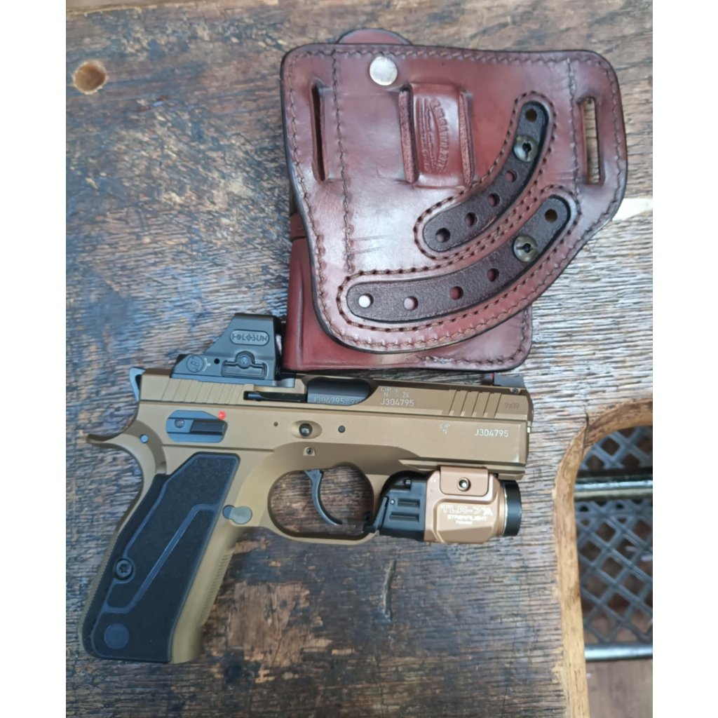 Kožené pouzdro KM Saddlery z pravé hovězí kůže, nastavitelné pro pistole se svítilnou. Kožené pouzdro vyrobené z kvalitní 3-3,2mm silné hovězí kůže. Ručně barvené, ručně tvarované. Je možno je nosit v šesti polohách a na opasek se upíná koženým průvlekem. Pouzdro je samosvorné, zbraň je jištěná svěrným kaleným perem a svěrnými šrouby.