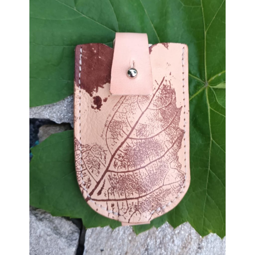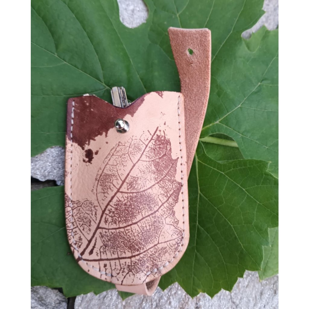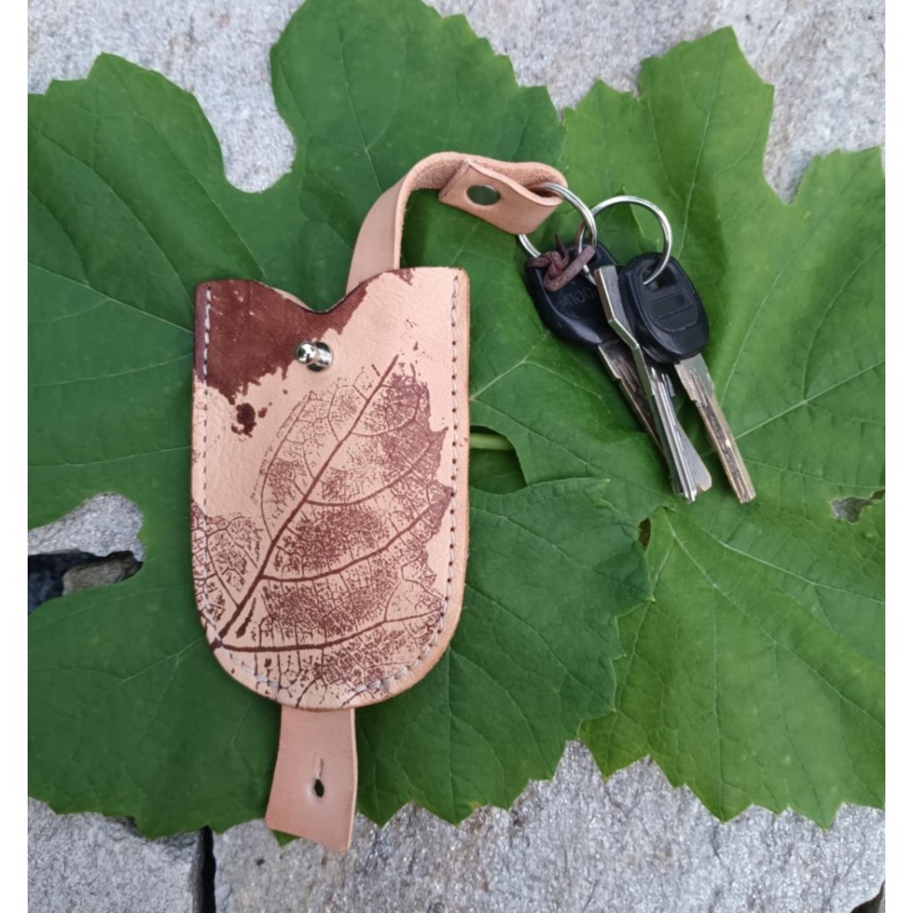 Kožená klíčenka z pravé hovězí kůže s ručním motivem otisku listů. Její velikost je 10,5 x 7 cm. Každá klíčenka je vzhledem k přírodním motivům jedinečná. Barva klíčenky je ideální v světlých odstínech, aby otisky byly výrazné. U výběru barvy je volba barvy celé kůže. Přírodní motiv je pak tištěn barvou, tak aby byl na barvě kůže zřetelný. V případě většího svazku klíčů stačí napsat do poznámky o jaký objem se jedná, velikost klíčenky je možné upravit.