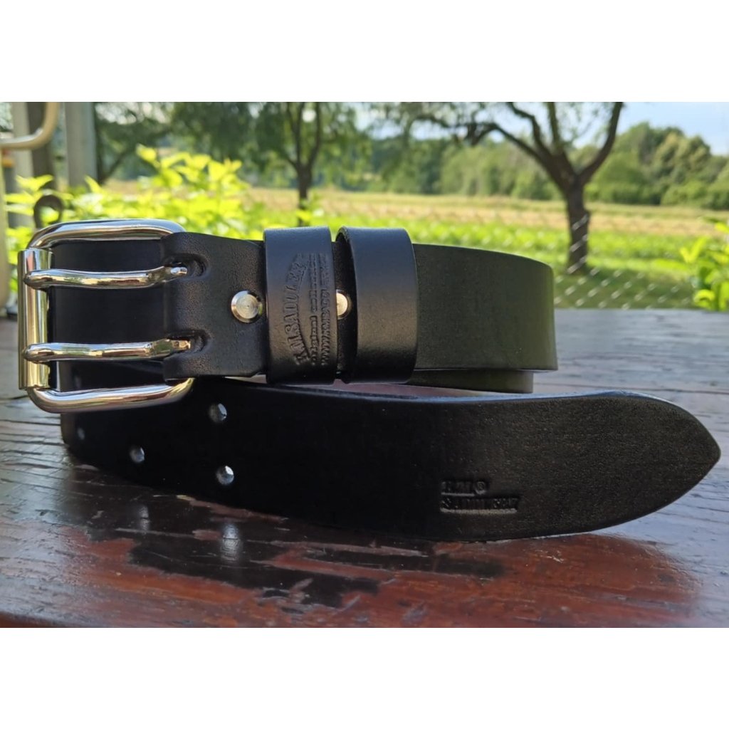 Kožený opasek K.M.Saddlery zhotovený z kvalitní hovězí kůže o síle 4,4mm a šířce opasku 4 cm. Opasek je ozdoben velmi pěknou sponou s dvěma trny vyrobenou z mosazi. Je to přezka z české firmy Kovolitectví Toman v Hradci nad Moravicí. Kůže opasku je při nošení velmi příjemná, nošením získává patinu a měkkost spojenou s pevností. Jde o probarvený opasek v koželužně. Kvalita kůže je stejná jako u ručně barveného, pouze povrch je jednolitý, není poznat přirozená struktura opasku. Opasek je již od začátku vláčný.